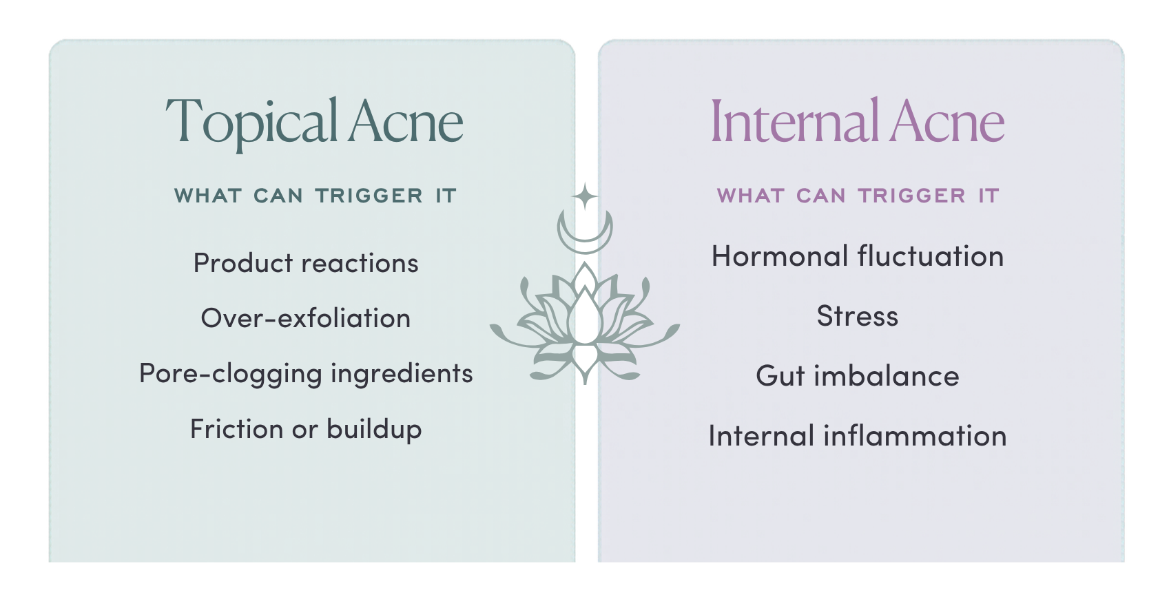 Topical acne is usually triggered by something happening on the outside, for example, product reactions, over-exfoliation, buildup, friction, or pore-clogging ingredients.