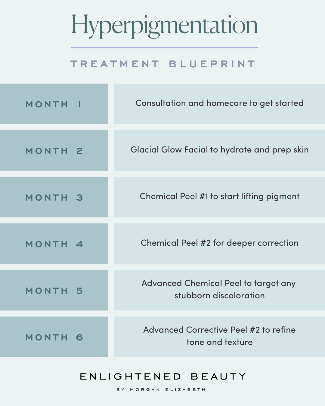 Month one begins with your consultation so I can assess your skin and start you on a customized brightening homecare regimen. This ensures your skin is prepped and protected before we begin in-office treatments. Month two introduces your first peel to start breaking up pigment and encouraging fresh cell turnover. In month three, we’ll reset and nourish your skin with a Glacial Glow Facial, keeping it calm, hydrated, and ready for the next step. Month four brings your second peel, this time working a little deeper to continue lifting discoloration. By month five, we’ll switch to a Hydrafacial to clear congestion, infuse brightening serums, and give your skin that fresh glow. Finally, month six ties everything together with your third peel, leaving your complexion noticeably more even, radiant, and refreshed.