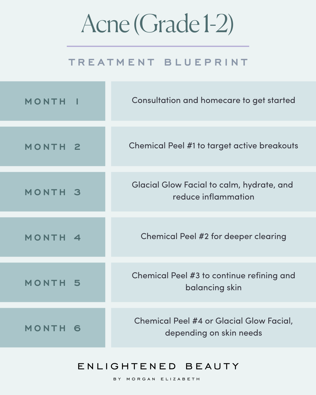 Month one is your consultation where I’ll see what we’re working with and get you on acne-focused home care so your skin is supported every single day. Month two is your first chemical peel to help reduce active breakouts and start refining texture. Month three is a Glacial Glow Facial to hydrate, calm, and reset your skin before we peel again. Month four brings in your second peel to keep the clearing process moving. Month five is another peel, working a little deeper as your skin builds tolerance. Finally, month six will either be a third peel or another Glacial Glow Facial — depending on what your skin needs most at that point. By the end of the blueprint, your breakouts are reduced, inflammation is calmer, and your skin feels clearer and healthier overall.
